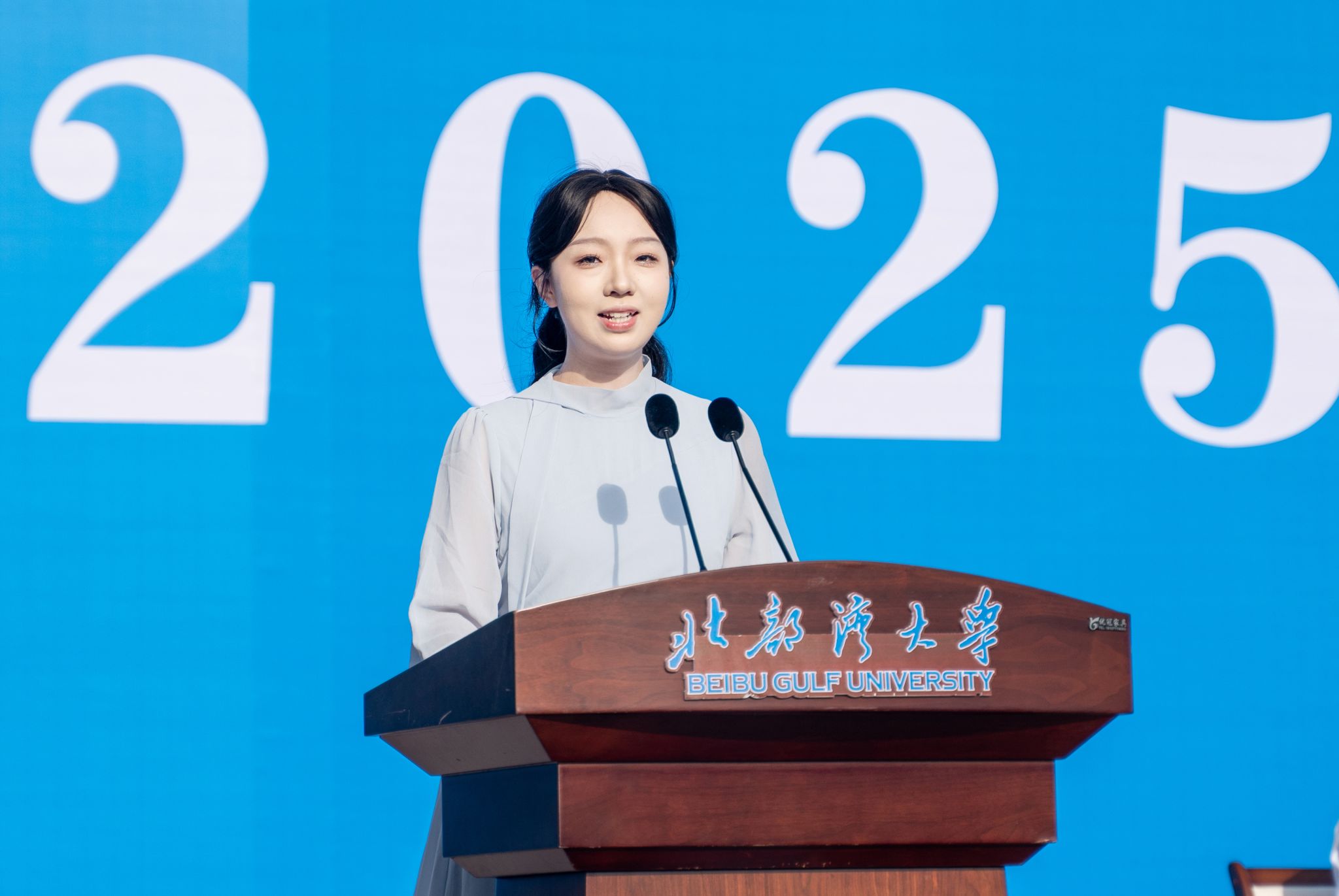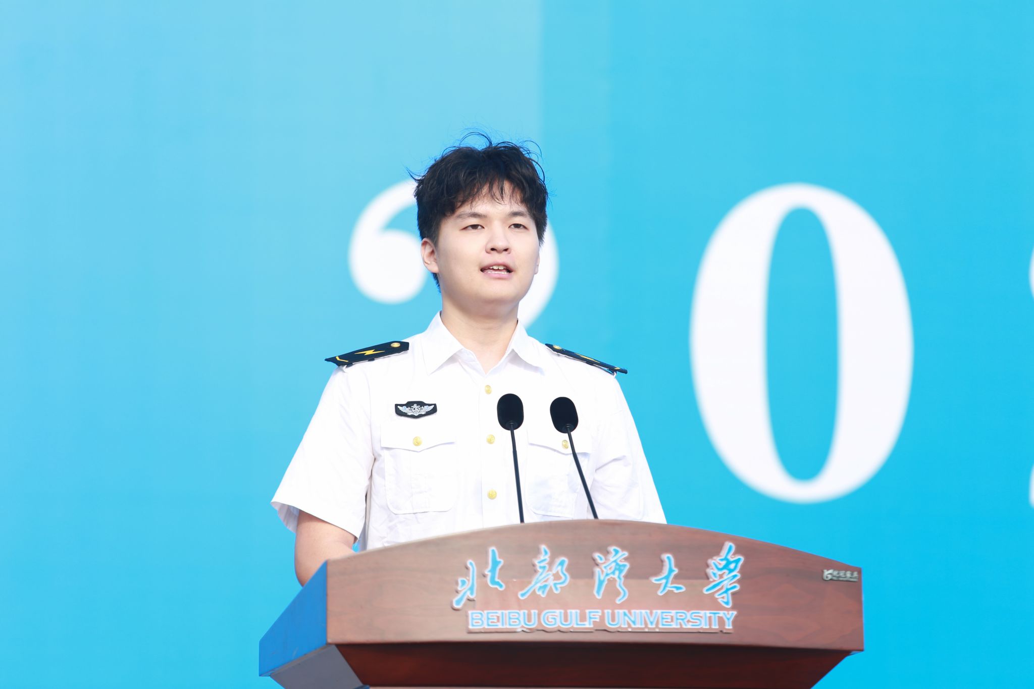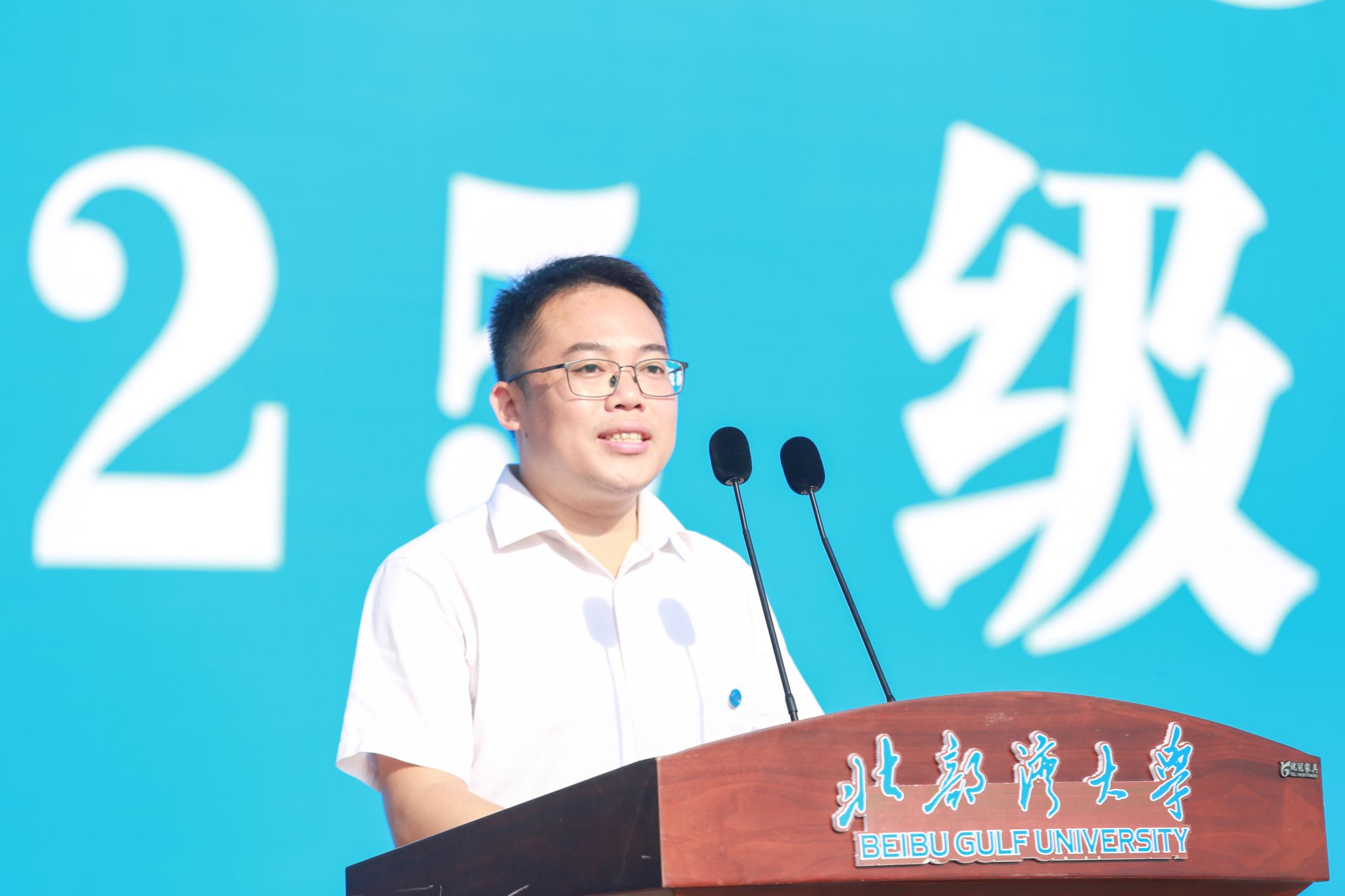 教师代表、学校科技处处长潘宇晨向2025级新生介绍了学校科研工作成果,同时勉励同学们充分用好学校科研资源,在实践中锤炼专业本领、涵养海洋精神。他特别强调,学校将着力推动应用型科研与学生培养深度融合:一方面,依托应用型科研项目为学生搭建实践平台,让同学们在参与科研的过程中提升动手能力与创新思维能力;另一方面,将引导教师把毕业设计、毕业论文、课程课题等与企业实际需求对接,由企业提出真实问题、设定研究方向,让学术探索更贴近产业实践、更具应用价值。他希望同学们从入学之初便树立清晰的成长目标,将个人理想融入民族复兴伟业,努力成长为德智体美劳全面发展的社会主义建设者和接班人,未来主动投身海洋强国建设与西部陆海新通道建设,以所学所长服务国家战略与区域发展。