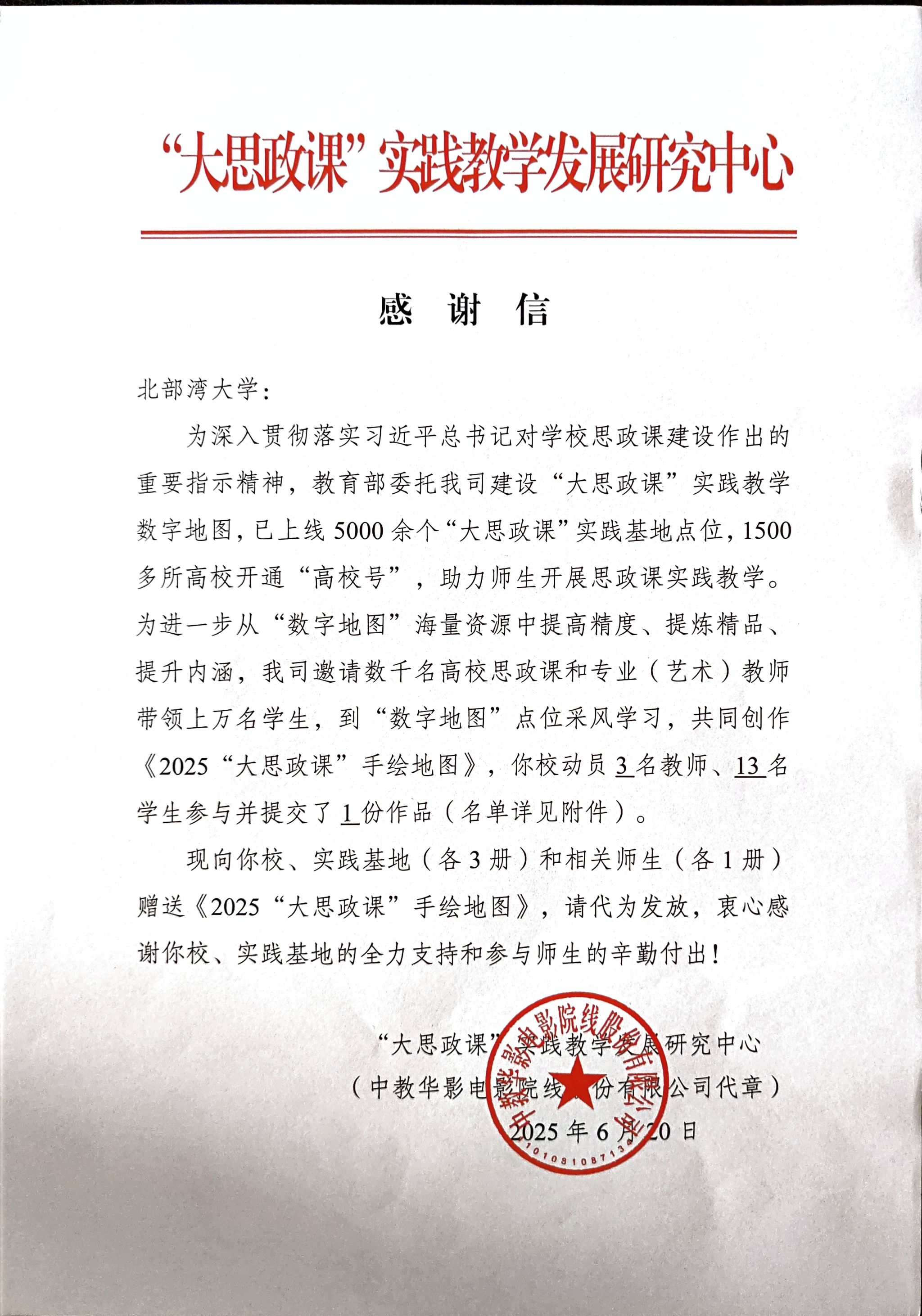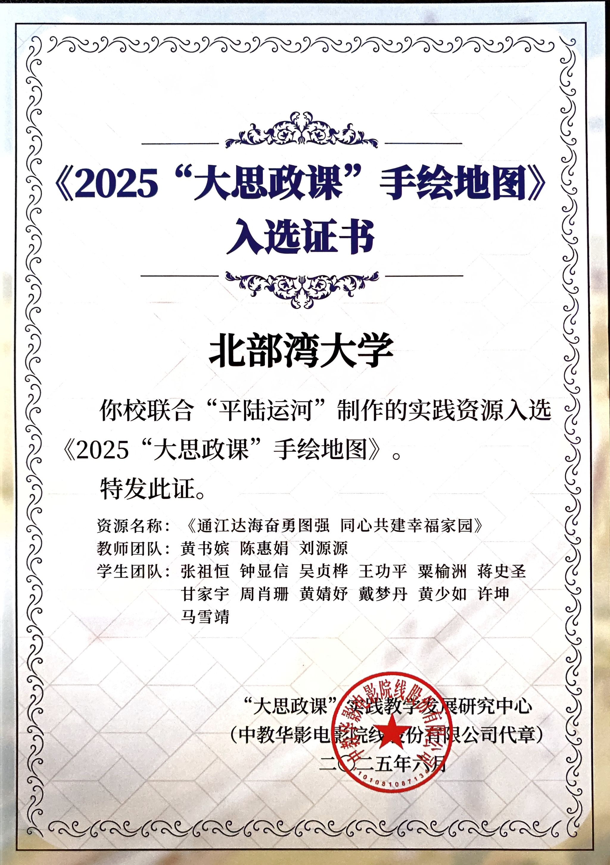 近日,教育部“大思政课”实践教学发展研究中心公布《2025“大思政课”手绘地图》入选名单。kaiyun体育马克思主义学院的3名教师和理学院、音乐舞蹈学院的13名学生共同提交的实践资源作品《通江达海奋勇图强 同心共建幸福家园》成功入选,并纳入“数字地图”体系。“大思政课”实践教学发展研究中心特向kaiyun体育发来感谢信,充分肯定kaiyun体育师生在实践教学资源建设中的积极贡献。