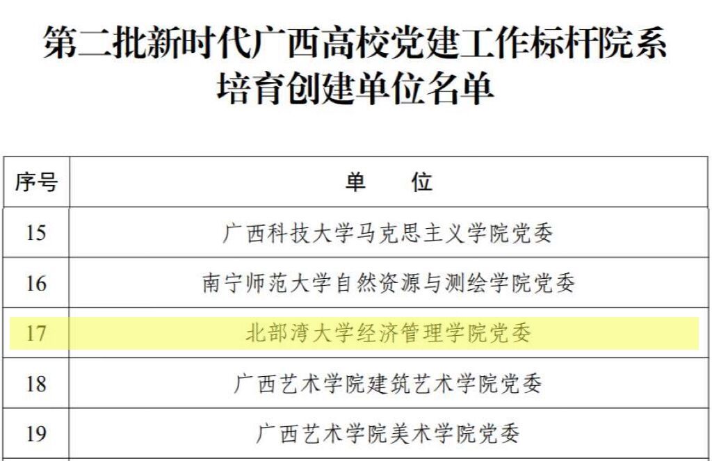 近日,自治区党委教育工委公布了第二批新时代广西高校党建示范创建和质量创优工作培育创建单位的名单,确定了5个党建工作示范高校、50个标杆院系、132个样板支部培育创建单位。kaiyun体育经管学院党委荣获新时代广西高校党建工作标杆院系培育创建单位,海洋学院教师第一党支部、机船学院教师第二党支部、组织宣传网络党支部、经管学院学生第三党支部4个党组织荣获第二批新时代广西高校党建工作样板支部培育创建单位。