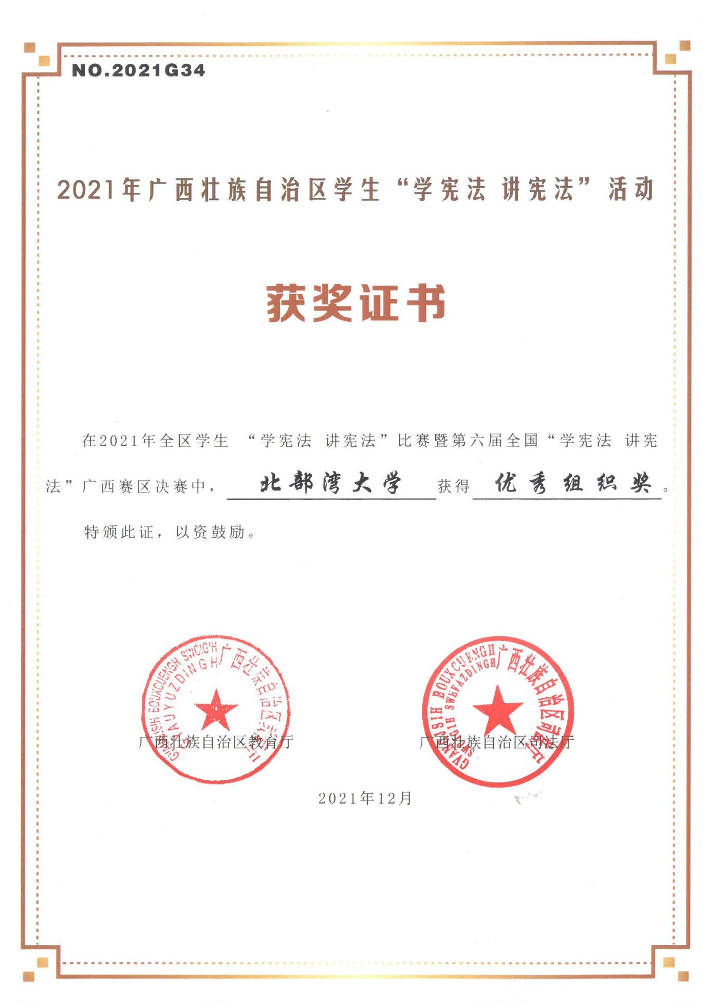 2021年,根据《自治区教育厅 自治区司法厅关于联合开展2021年全区学生“学宪法 讲宪法”活动的通知》要求,党委学生工作部(处)牵头联系相关部门和各学院开展了形式多样的宪法宣传教育活动。党委宣传部牵头组织了全区学生“宪法卫士”2021年行动计划,与党委学生工作部(处)通力配合,组织发动全校学生积极参与全区学生“宪法卫士”2021年行动计划,学校最终以92.5%的参与率荣获2021年度全区“学宪法 讲宪法”优秀组织奖。