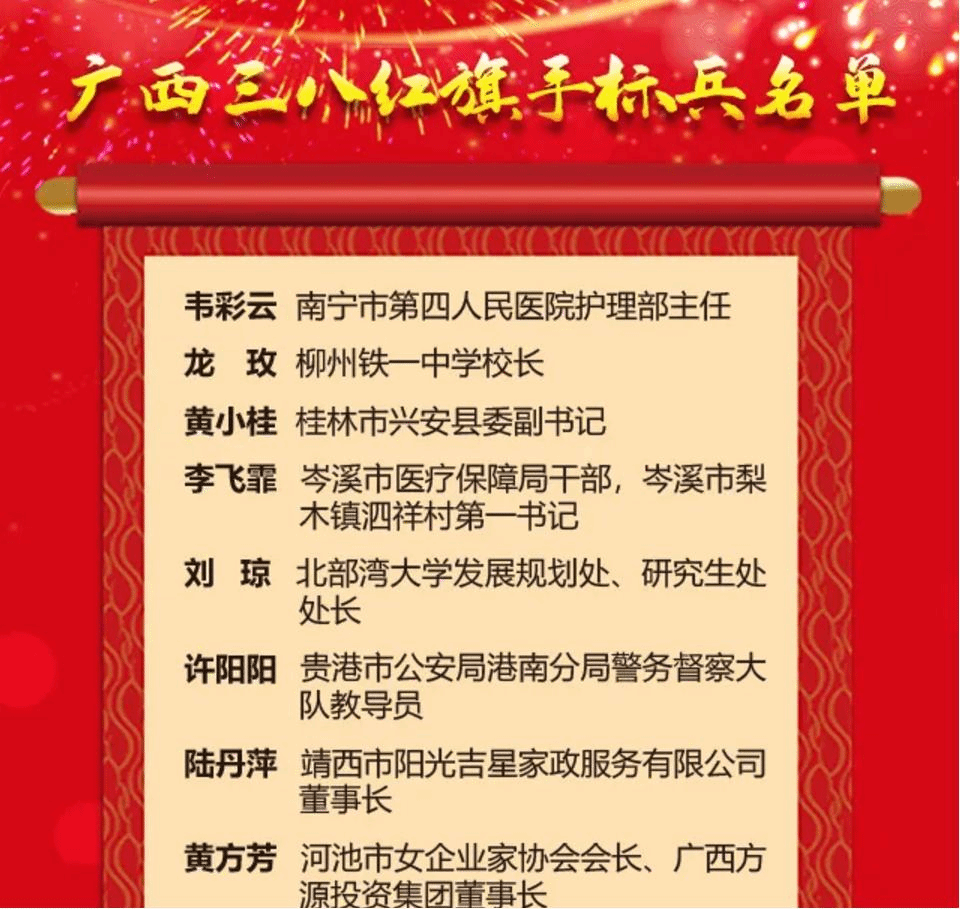 据广西壮族自治区妇女联合会消息,共有10名女性获广西“三八”红旗手标兵荣誉称号。此次表彰旨在树立榜样,团结广大妇女更加紧密地团结在以习近平同志为核心的党中央周围,深入贯彻落实党的十九大和十九届二中、三中、四中、五中全会精神,增强“四个意识”、坚定“四个自信”、做到 “两个维护”,为全面建设社会主义现代化国家、夺取新时代中国特色社会主义伟大胜利,建设壮美广西、共圆复兴梦想贡献巾帼力量,以优异成绩庆祝中国共产党成立100周年。