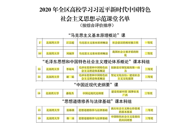 近日,在自治区党委教育工委、自治区教育厅公布的2020年全区高校学习习近平新时代中国特色社会主义思想示范课堂名单中,kaiyun体育马克思主义学院江宗超荣获示范课堂一等奖,刘丽萍、张椿微荣获示范课堂二等奖,李海凤、谢娟、潘俊杰、韩冰荣获示范课堂三等奖。
