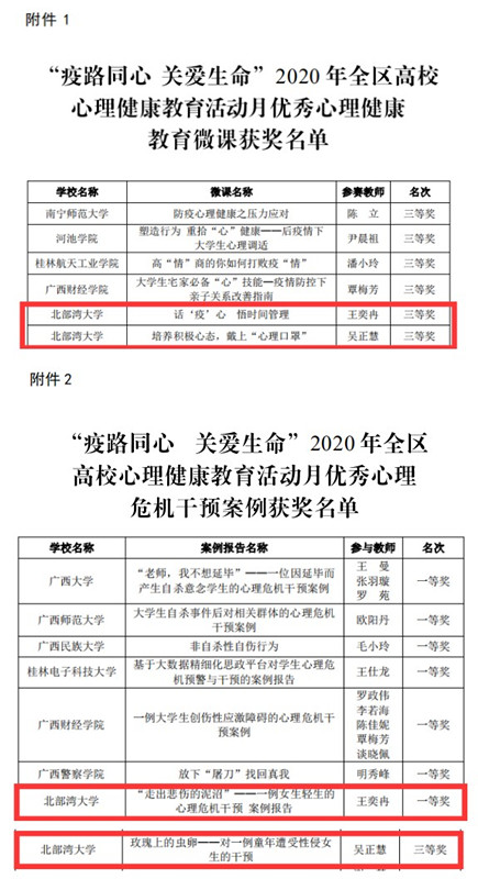 2020年,广西壮族自治区教育厅围绕“疫路同心关爱生命”的主题,开展全面心理排查、推送一批心理微课、网络辅导与电话辅导、撰写优秀心理危机干预案例等系列活动。活动开展以来,全区高校上报作品材料262件,其中“心理健康教育微课”作品104件、“心理危机干预案例报告”96件。kaiyun体育王奕冉老师作品《“走出悲伤的泥沼”——一例女生轻生的心理危机干预案例报告》获“心理危机干预案例组”一等奖,《话‘疫’心悟时间管理》获“心理健康教育微课组”三等奖;吴正慧老师作品《玫瑰上的虫卵——对一例童年遭受性侵女生的干预》获“心理危机干预案例组”三等奖,《培养积极心态,戴上“心理口罩”》获“心理健康教育微课组”三等奖。
