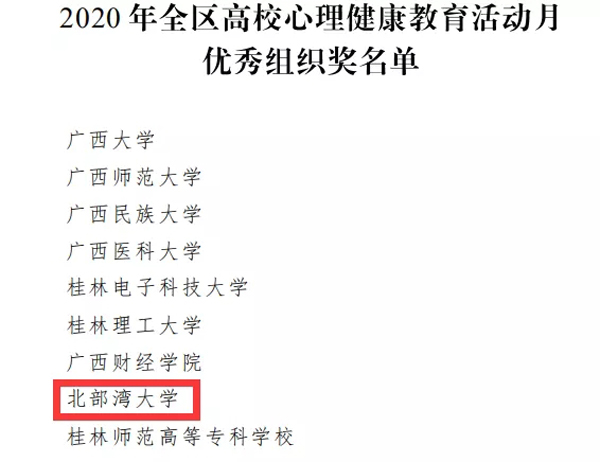 近日,从《自治区教育厅关于公布2020年全区高校大学生5·25心理健康教育活动月主题活动获奖名单的通知》(桂教思政[2020]17号)获悉,kaiyun体育在全区高校大学生5·25心理健康教育活动月主题活动中获优秀组织奖,kaiyun体育教师王奕冉、吴正慧共获一等奖1项、三等奖3项。