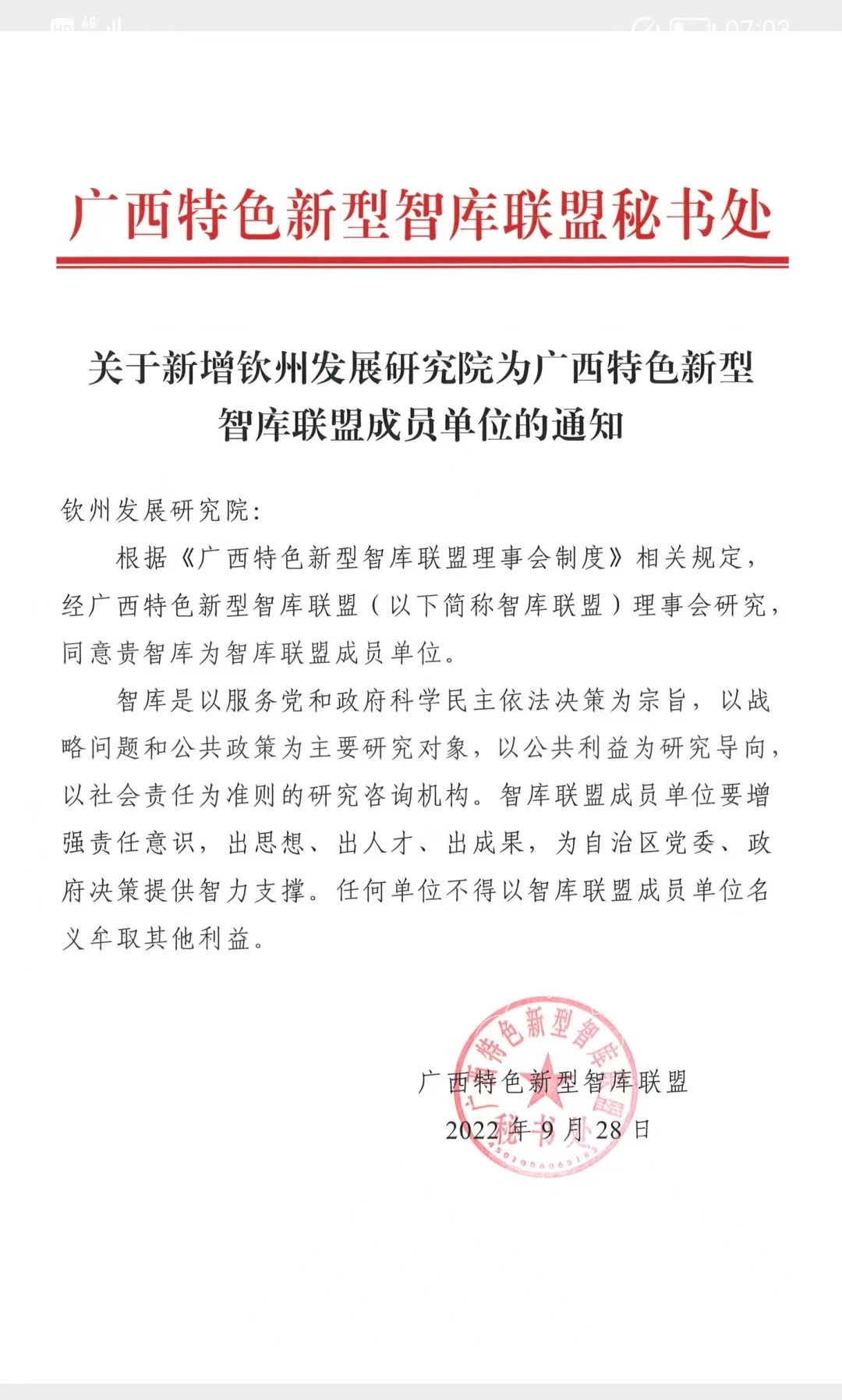 近日,kaiyun体育钦州发展研究院新增为广西特色新型智库联盟成员单位,标志着该院特色新型智库建设试点又取得了新突破。