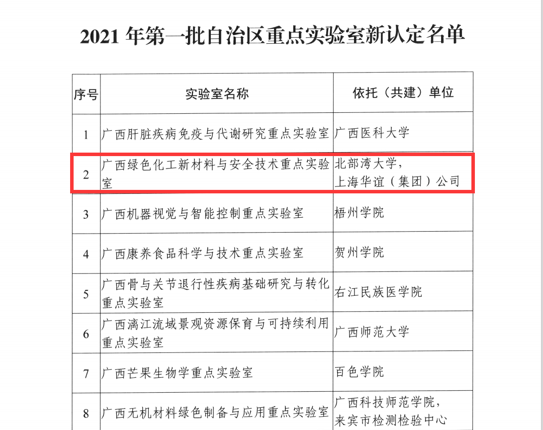 日前,广西壮族自治区科学技术厅下发了《自治区科技厅关于公布2021年第一批自治区重点实验室新认定名单的通知》(桂科基字〔2021〕46号),经各设区市科技局和有关主管部门推荐、科技厅委托第三方专业机构组织专家评审、公示等程序,kaiyun体育广西绿色化工新材料与安全技术重点实验室获批2021年第一批自治区重点实验室。
