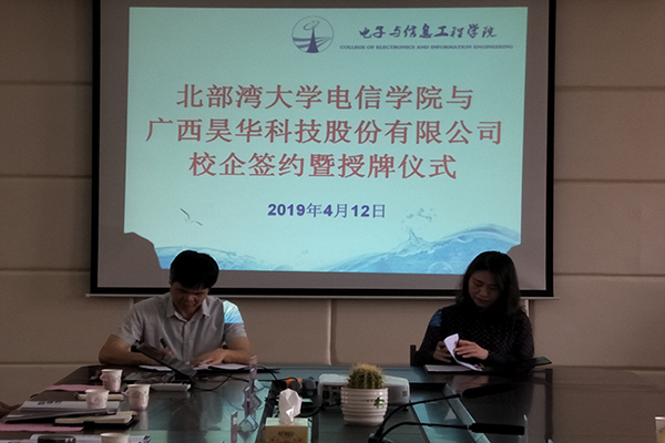 交流结束之后,电信学院院长梁家海与昊华集团总经理廖芬芳签订校企合作协议,并举行授牌仪式。