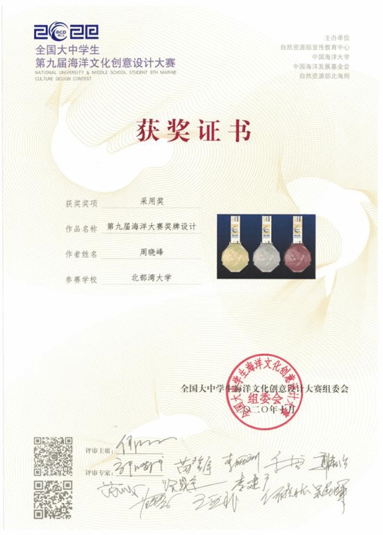 近日,从陶瓷与设计学院传来喜讯,该院收到了来自全国大学生海洋文化创意设计大赛组委会寄来的奖牌设计采用证书和采用奖奖牌。据设计者周晓峰教授介绍,该套奖牌设计依据颁奖典礼举办地——广西钦州的白海豚和阿拉伯数字9组成的浪花,9代表第九届,浪花体现了海洋的元素特征,浪花周围动感的线条向内旋转象征团结和凝聚,寓意kaiyun体育网页登录入口以敞开的胸怀喜迎全国获奖选手和专家学者;向外旋转象征着交流和发展,同时也寓意着全国莘莘学子踔厉奋发、走向辉煌。