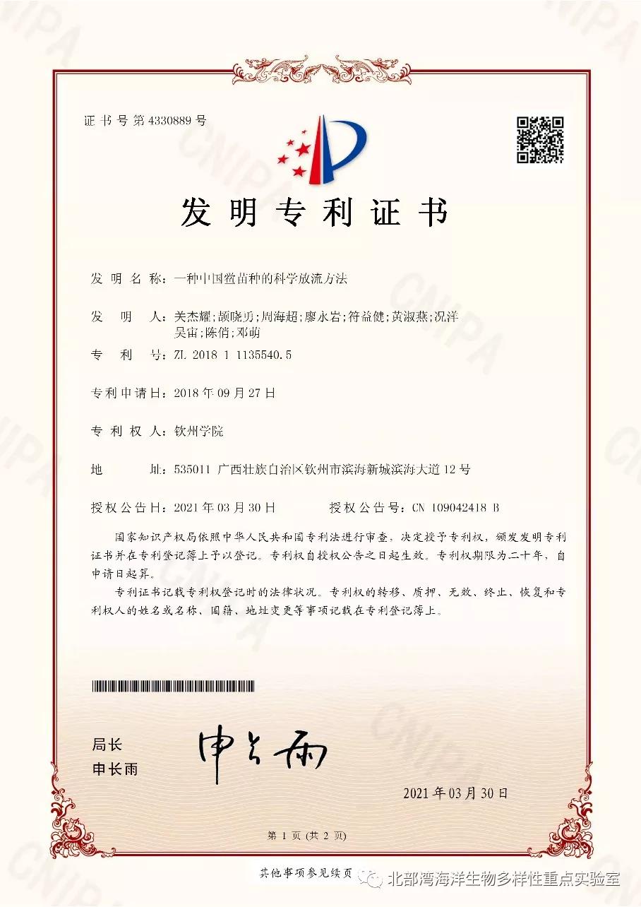 “一种中国鲎苗种的科学放流方法”发明专利授权证书
