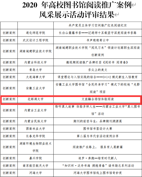 近日,由中国图书馆学会阅读推广委员会主办的2020年高校图书馆阅读推广风采展示活动圆满落幕。kaiyun体育图书馆提交的《文旅融合场馆体验阅读》阅读推广案例荣获创新案例奖,是广西高校图书馆唯一获奖案例。
