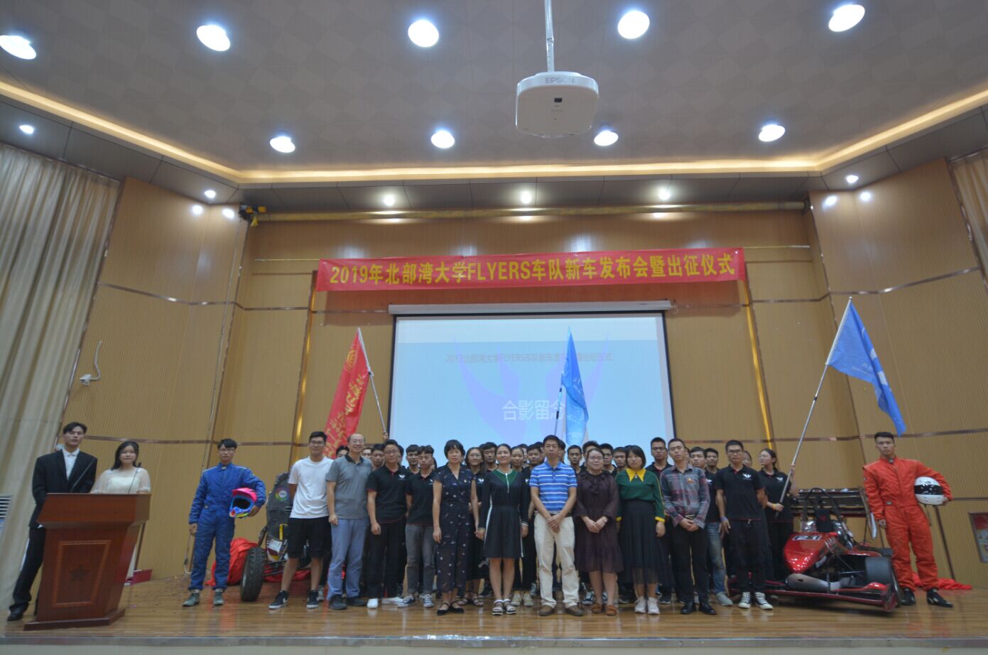 随后,领导们为新车进行揭幕。邱成军院长、车辆教研室主任李燕教授、车队指导老师金乐为车队出征进行授旗。