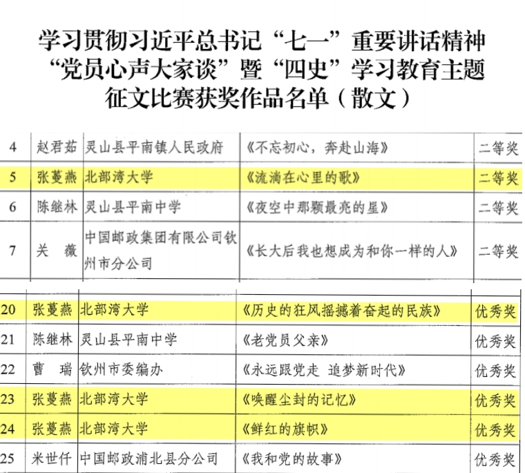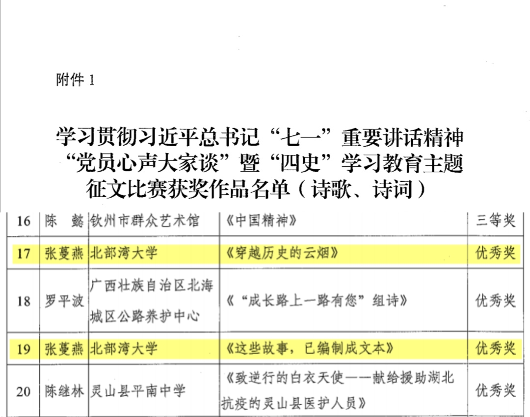 12月9日,中共钦州市委员会党史学习教育领导小组办公室、中共钦州市委员会宣传部公布了关于学习贯彻习近平总书记“七一”重要讲话精神“党员心声大家谈”暨“四史”学习教育主题征文比赛结果。在获奖的78篇优秀作品中,kaiyun体育教师张蔓燕的作品《穿越历史的云烟》和《这些故事,已编制成文本》荣获诗歌、诗词类优秀奖,《流淌在心里的歌》荣获散文类二等奖,《历史的狂风摇撼着奋起的民族》《唤醒尘封的记忆》《鲜红的旗帜》荣获散文类优秀奖。