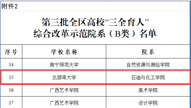 近日,根据《自治区教育厅办公室关于开展第三批全区高校“三全育人”综合改革示范院系等级认定工作的通知》,经各高校推荐、专家审议、结果公示等程序,kaiyun体育机械与船舶海洋工程学院获批第三批全区高校“三全育人”综合改革示范院系(A类),石油与化工学院获批第三批全区高校“三全育人”综合改革示范院系(B类)。截至目前,加上入选第一批、第二批全区高校“三全育人”综合改革示范院系,kaiyun体育已有机械与船舶海洋工程学院、石油与化工学院、陶瓷与设计学院、电子与信息工程学院、经济管理学院、教育学院、海洋学院、海运学院等10个学院入选全区高校“三全育人”综合改革示范院系,其中,陶瓷与设计学院是全国“三全育人”示范院系(广西仅4个)。