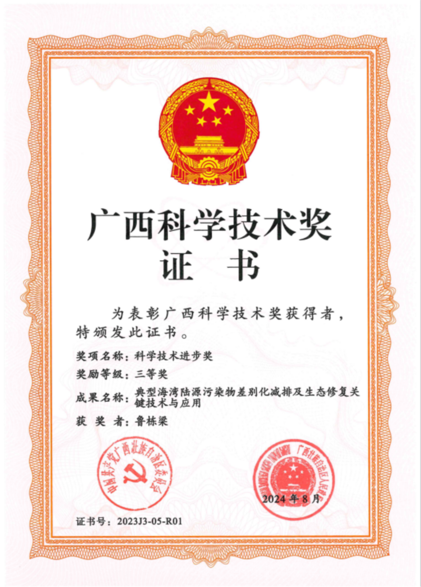 2023年度广西科学技术进步奖三等奖 | 典型海湾陆源污染物差别化减排及生态修复关键技术与应用 | 鲁栋梁、段克、杨斌、朱文娟、许玉萍、亢振军、苏莹、周姣娣、黄海方 |