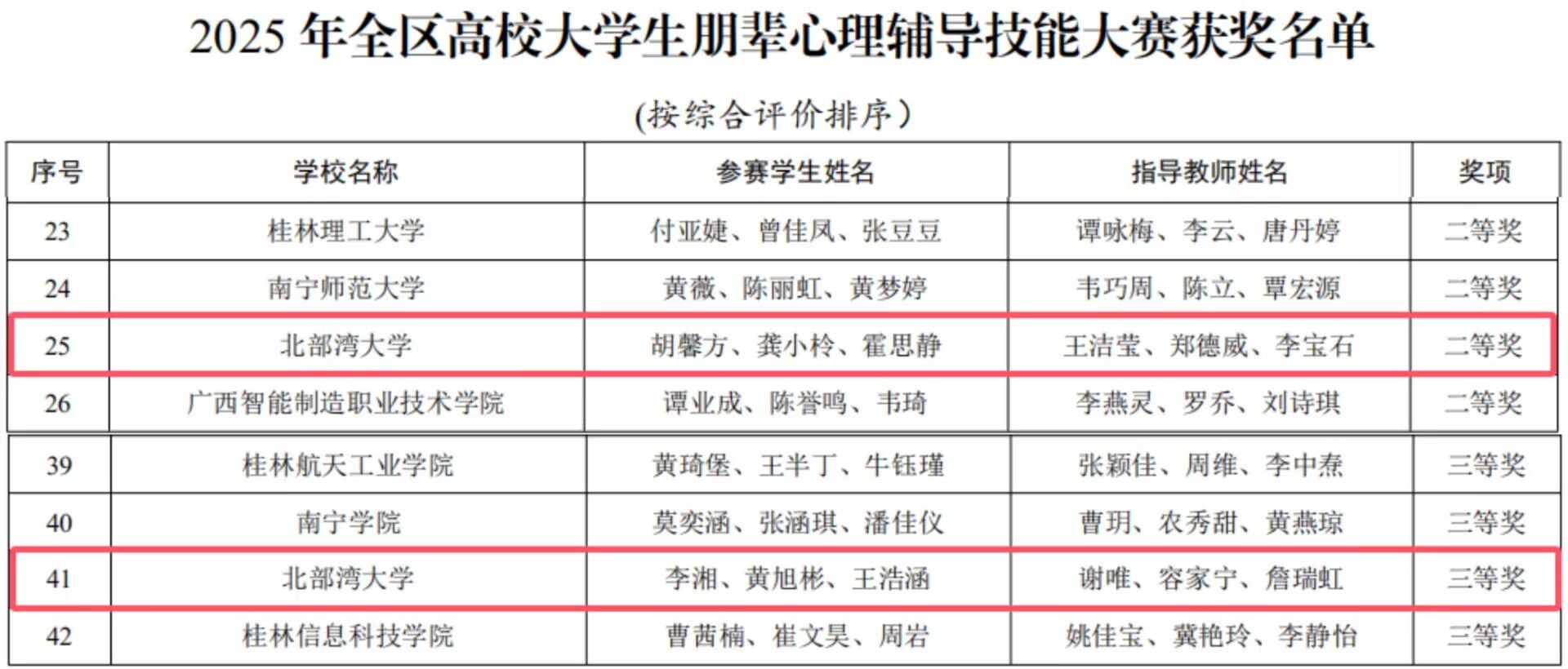 在全区高校心理健康教育微课大赛中,kaiyun体育教师作品《是我想太多?——3招破除过度思考》荣获教师组二等奖;学生作品《“宿舍说话之道”:教你如何表达需求而不伤人》荣获学生组三等奖。在全区高校大学生朋辈心理辅导技能大赛中,由胡馨方、龚小柃、霍思静三位同学组成的团队获二等奖;由李湘、黄旭彬、王浩涵三位同学组成的团队获三等奖。