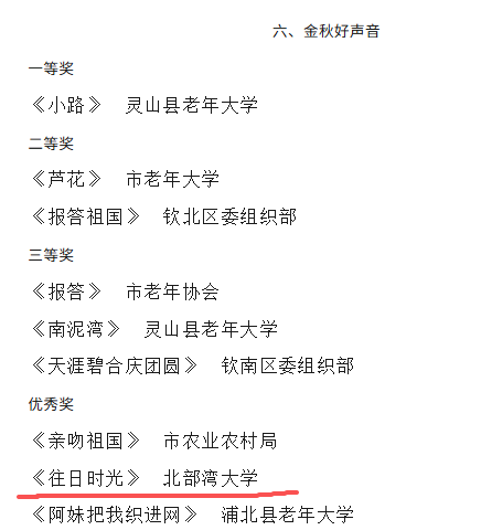 王传善老师的作品荣获书法一等奖;张蔓燕老师的《墨香里的银发影》获主题征文一等奖;裴仁伟老师的《教师,一个很难说“我没空”的职业》获主题征文二等奖;钟国才老师的《读习近平总书记给“银龄行动”老年志愿者回信有感》获主题征文三等奖;钟子梁老师的《平陆运河入海流》获主题征文优秀奖。退休教师声乐小组唱荣获“金秋好声音”优秀奖。