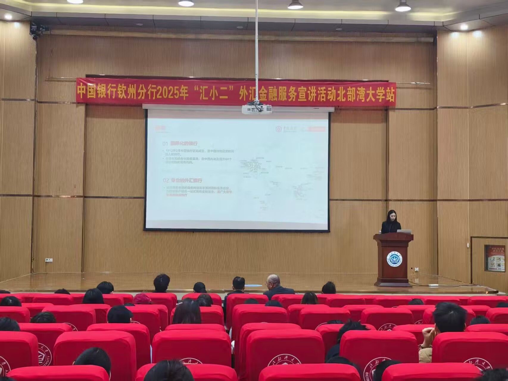揭牌仪式后,中国银行钦州分行宣讲团队面向师生开展2025年“汇小二”外汇金融服务专题宣讲,现场解读跨境政策、回应师生关切,反响良好。