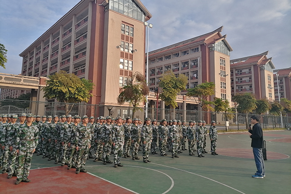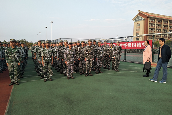 学院领导看望在运动场上军训的2019级新生