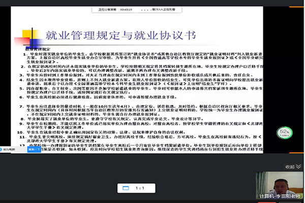 会上,李副书记分析当今疫情下的就业形势,对毕业班学生所面临的就业情况做研判,同时通过学院就业的真实案例,生动形象的解读今年“国、省、市、县招”、“校招、社招”、“西部计划志愿者”、“选调生”和“参军入伍”等政策,并对求职简历、面试和就业协议等要注意的事项进行了提醒和讲解。李副书记希望同学们秉承“先就业、后择业”理念,保持积极乐观的态度,多学习、多投简历,尽快找到理想的工作岗位。