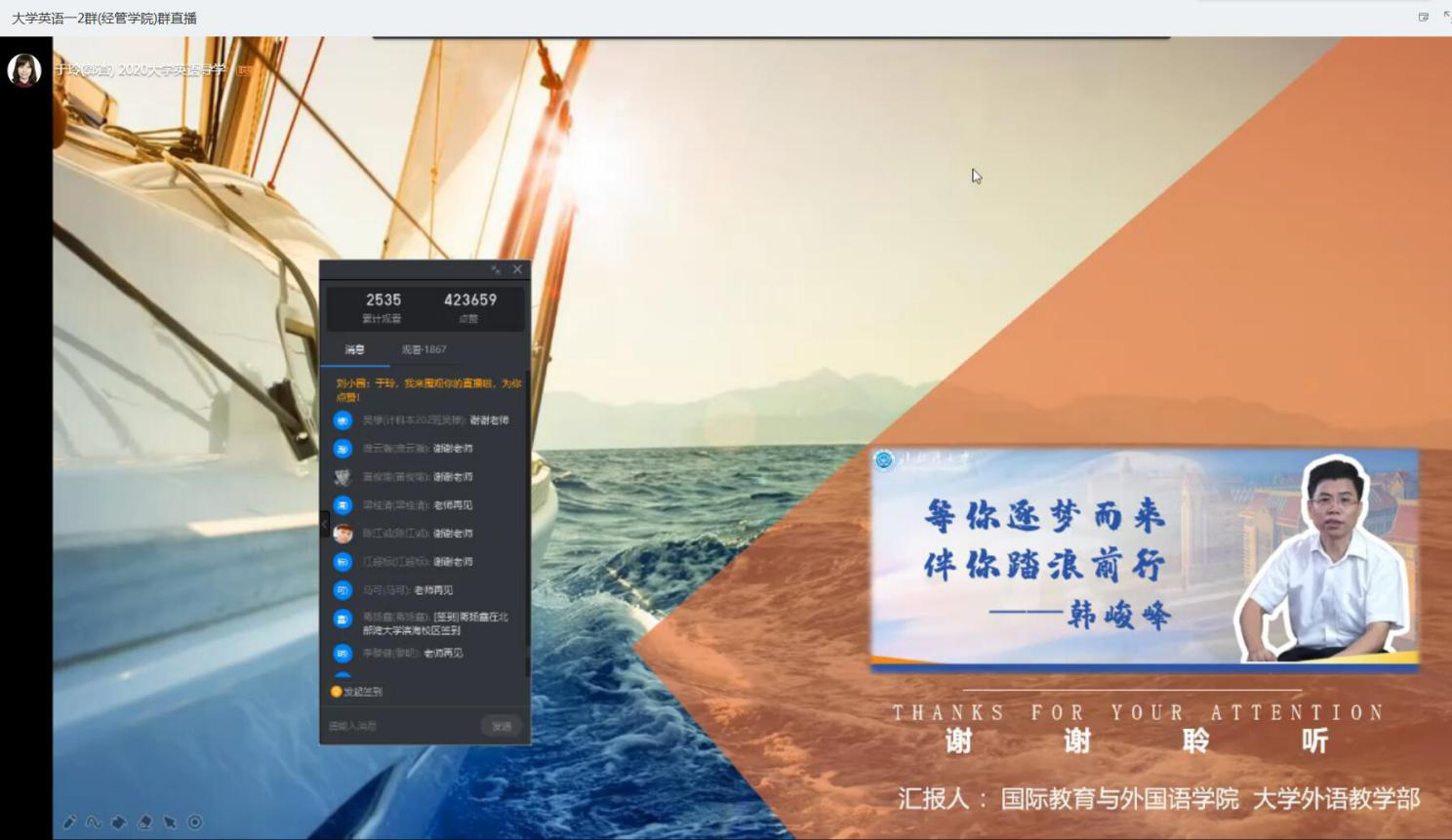 为了让2020级新生更好更快地了解kaiyun体育大学英语教学工作并提前做好学习规划,9月24日晚,国际教育与外国语学院以钉钉在线直播的方式,面向全校2020级新生讲授“大学英语导学”第一课。该讲座由大学外语教学部郭杏副主任主讲。