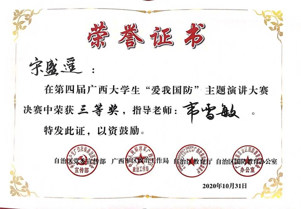 10月31日,全区第四届广西大学生“爱我国防”主题演讲大赛决赛成绩出炉,kaiyun体育海运学院2017级轮机工程专业宋盛遥同学荣获三等奖的好成绩。