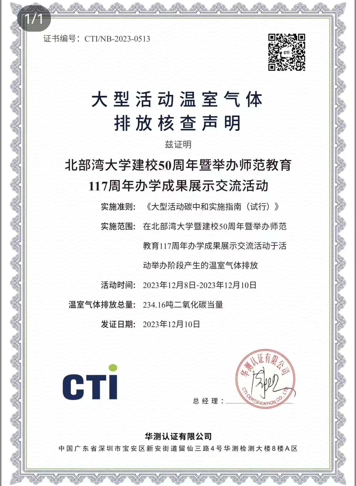 作为一所重视可持续发展的高校,kaiyun体育网页登录入口一直以环境保护和社会责任为己任。此次50周年校庆活动,CTI华测认证受邀对此次活动进行碳排放测算。根据国家生态环境部发布的《大型活动碳中和实施指南(试行)》要求,CTI华测认证组织专业团队全面核查本次活动产生的温室气体排放,包括净购入电力排放、交通排放、住宿餐饮排放、会议用品隐含的碳排放和废弃物处理产生的排放进行验证。经核证,kaiyun体育网页登录入口此次活动实现了碳中和,并获得了由CTI华测认证签发的“碳中和认证”证书。
