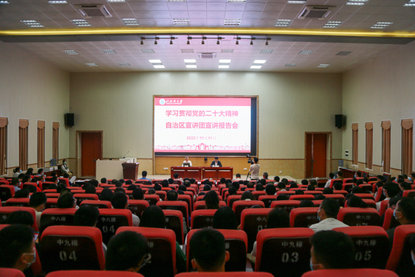 11月11日下午,自治区宣讲团成员,党委政策研究室副主任、财经办副主任黄兰喜到校作学习贯彻党的二十大精神自治区宣讲团宣讲报告会。报告会由校党委书记韩峻峰主持。全体在家校领导,全体中层干部,全体学校党委理论学习中心组成员,全体学校党委讲师团成员,思政课教师和专职辅导员代表,学生代表等参加报告会。