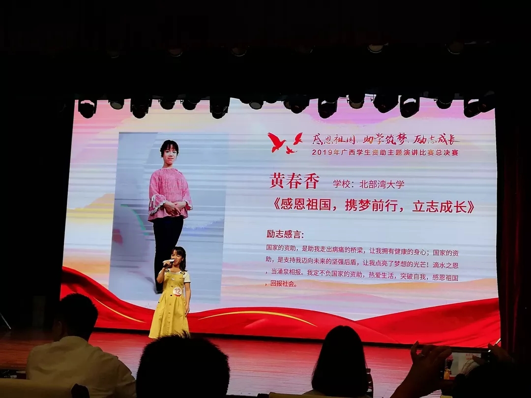 2019年6月2日,这个身高不到一米三的女孩,站在了广西学生资助主题演讲比赛总决赛的舞台,从全区70多所高校、77名选手中脱颖而出,夺得了第一。当她载誉归来时,学校党委书记赵君为她送上了一束鲜花,并感叹道:“优秀和成功,总是属于自信的奋进者,黄春香同学是有力量的好榜样。”