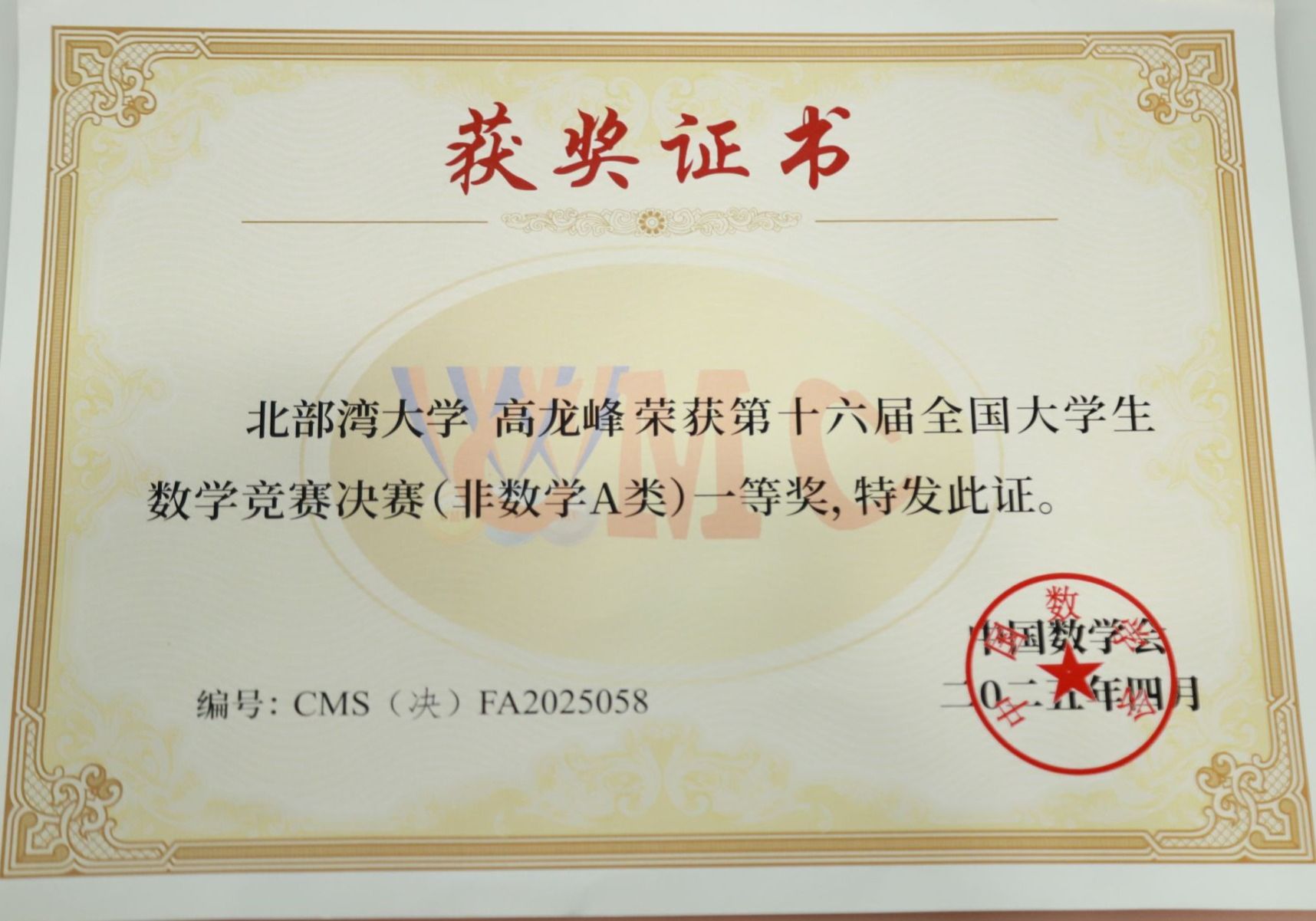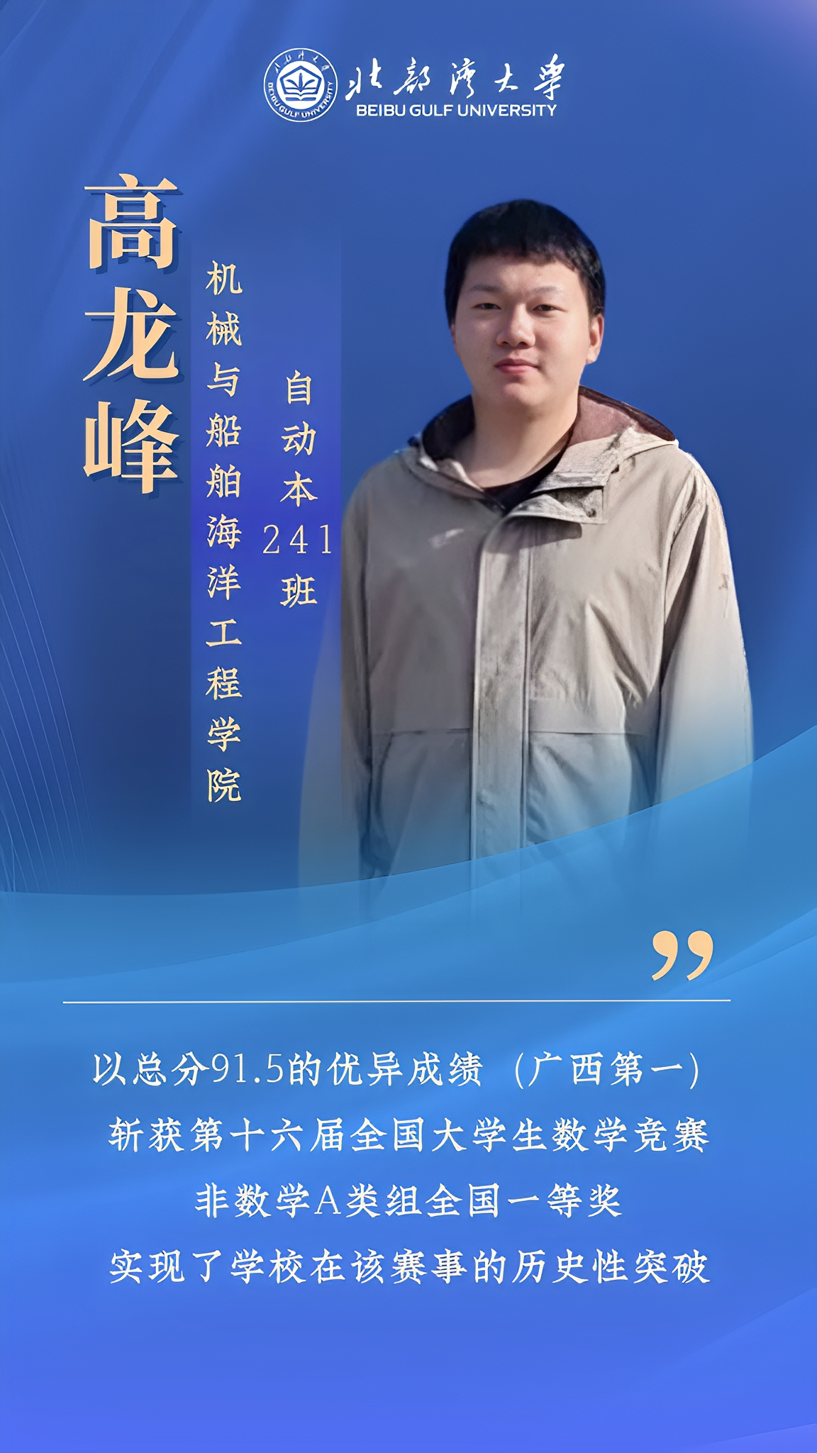 2025年4月,喜报从浙江师范大学举办的第十六届全国大学生数学竞赛决赛现场传来,kaiyun体育机械与船舶海洋工程学院自动化专业241班高龙峰同学以总分广西第一的优异成绩斩获非数学A类组全国一等奖。这刷新了kaiyun体育在该项赛事中的最佳纪录,让这位数学爱好者走进了我们的视野。