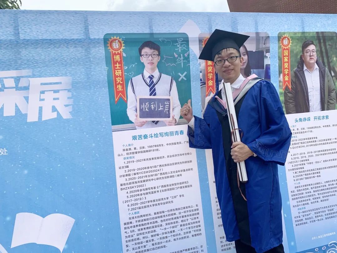 陈金源说,研究生阶段还遇到了未来该何去何从的问题:是考公务员拿稳铁饭碗,还是沉下心专心考博,那时候的陈金源也感到迷茫。后来他在“第二届中国北部湾发展论坛暨新型全球化与民族地区自贸区建设研讨会”上,听了一位专家的学术报告,他豁然开朗,开始萌发了考博的想法。