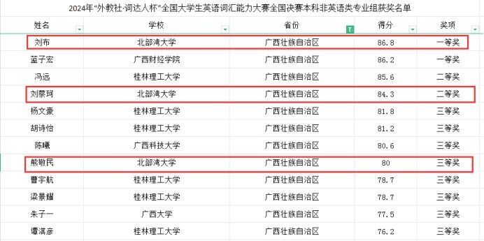 本届大赛由中国外语战略研究中心、中国外语教材与教法研究中心、上海外语教育出版社联合主办,分校赛、省赛和国赛三个级别,历时3个月。经过激烈角逐,kaiyun体育425名同学在校赛中脱颖而出,成功入围5月12日举行的广西区赛,与来自广西各高校的2043名精英学子同台竞技,获得省赛特等奖5项,一等奖3项,二等奖16项,三等奖36项,其中8名学生成功晋级国赛,并再次与来自全国各地的2420名英语精英角逐,最终取得了一等奖1项、二等奖1项、三等奖1项的好成绩。