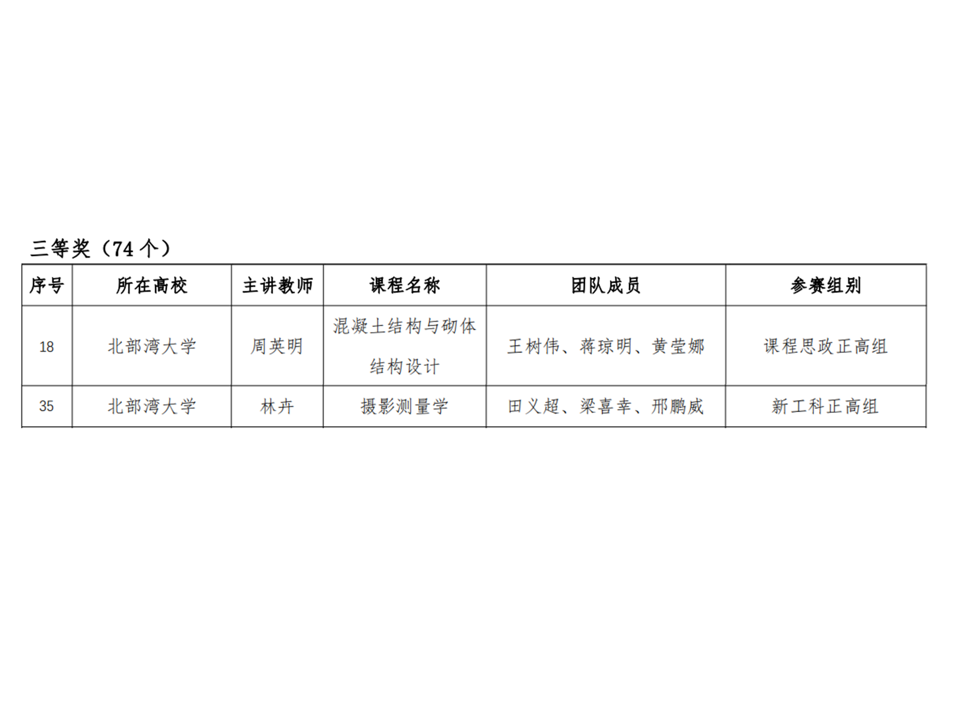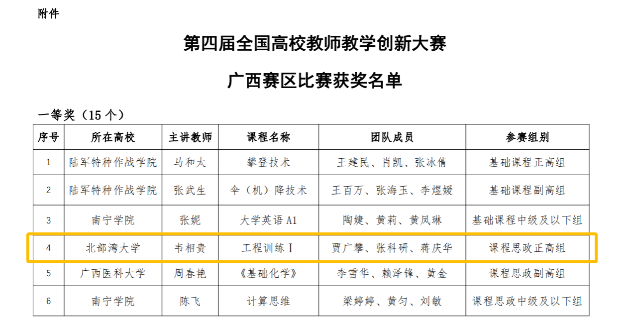 广西第四届高校教师教学创新大赛由自治区教育厅指导、广西高等教育学会主办,广西大学承办。大赛共有218个教师(团队)入围,经过网络评审,119个教师(团队)晋级决赛,最终产生一等奖15项、二等奖30项、三等奖74项。