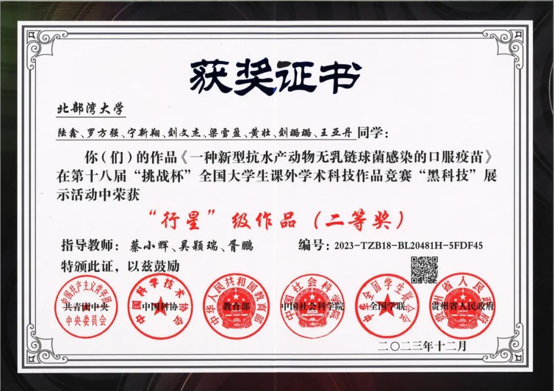 第十八届“挑战杯”全国大学生课外学术科技作品竞赛“黑科技”展示活动全国“行星”级作品(二等奖)获奖证书
