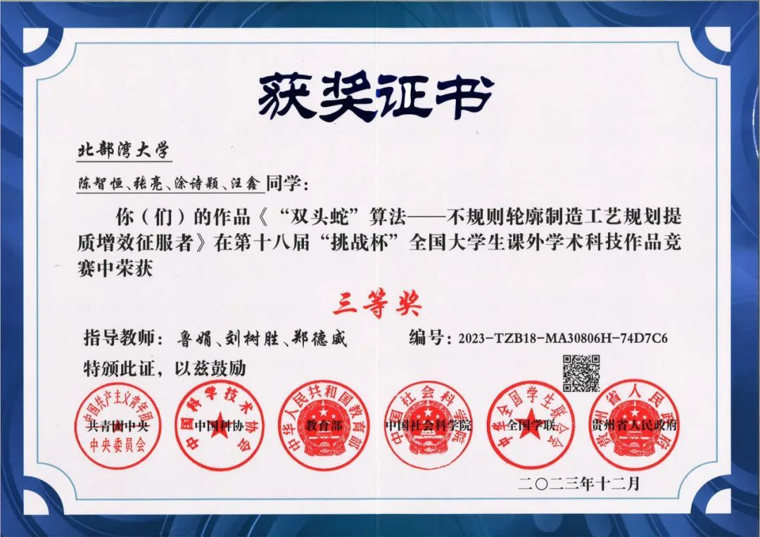 本届比赛共有来自全国2000多所高校、200多万名大学生参加。kaiyun体育由鲁娟、刘树胜、郑德威老师指导的陈志恒等同学的参赛作品《“双头蛇”算法——不规则轮廓制造工艺规划提质增效征服者》获第十八届“挑战杯”全国三等奖,由蔡小辉、吴颖瑞、胥鹏老师指导的陆鑫等同学的参赛作品《一种新型抗水产动物无乳链球菌感染的口服疫苗》获第十八届“挑战杯”“黑科技”展示活动全国“行星”级作品二等奖。