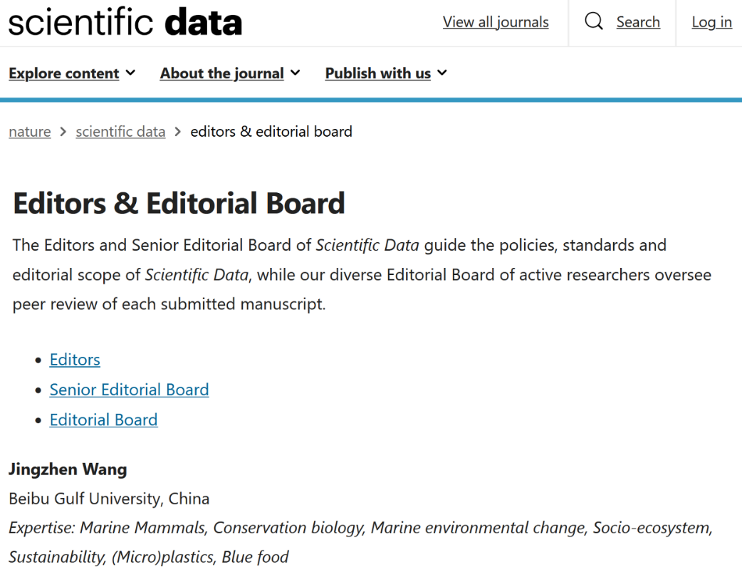 近日,kaiyun体育海洋学院王京真教授,应Nature数据期刊Scientific Data邀请,担任该刊编委(Editorial Board)。