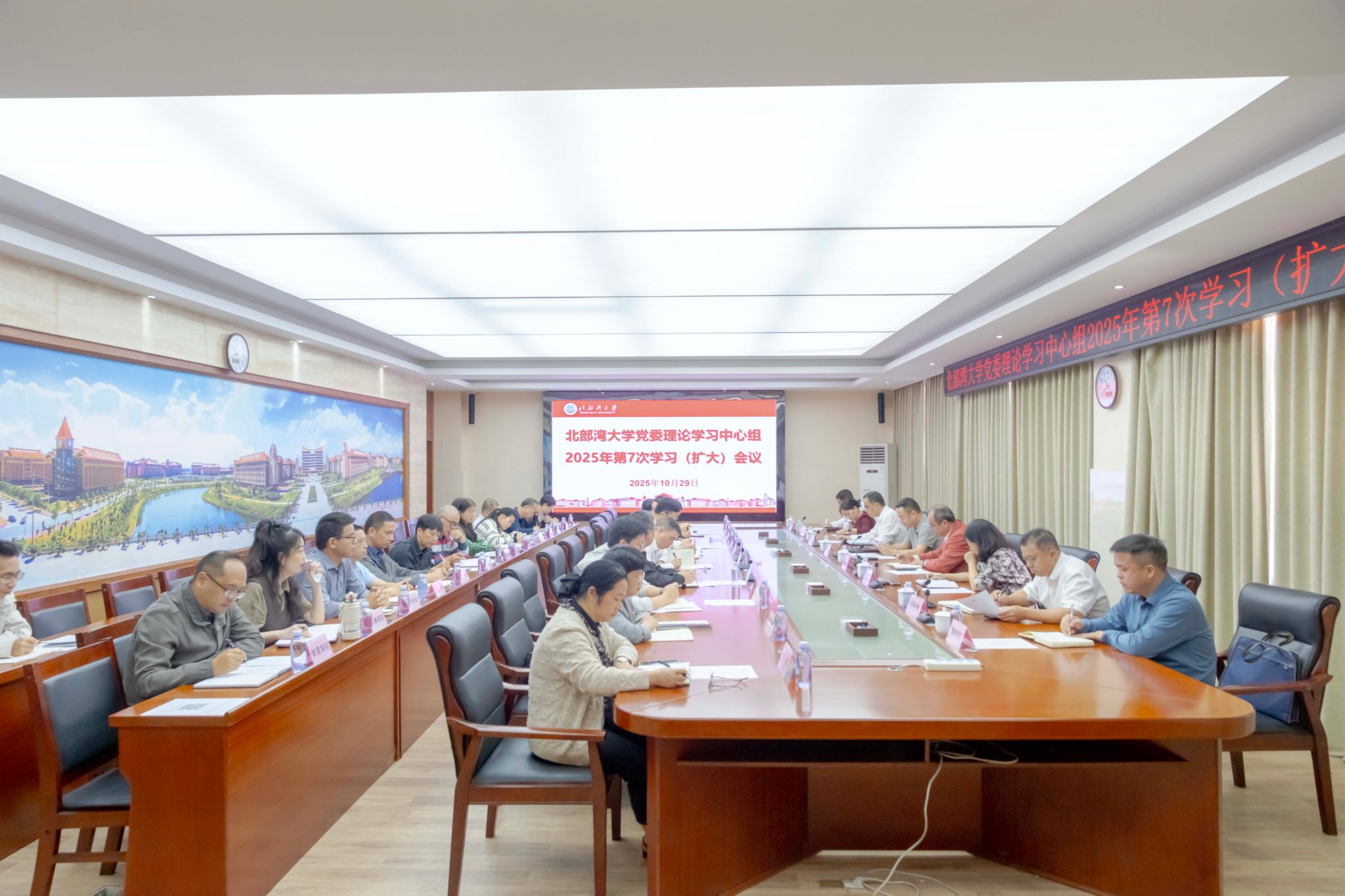 10月29日,学校党委理论学习中心组2025年第7次专题学习会议在办公楼523会议室举行,认真学习《习近平谈治国理政》第五卷、党的二十届四中全会精神、《中国共产党思想政治工作条例》以及习近平总书记近期重要讲话、重要指示、重要文章和中央有关会议、文件精神等。校党委书记、校长苗剑主持会议并讲话。学校党委理论学习中心组成员参加会议,学校纪委副书记、二层机构党组织书记及相关职能部门负责人列席会议。